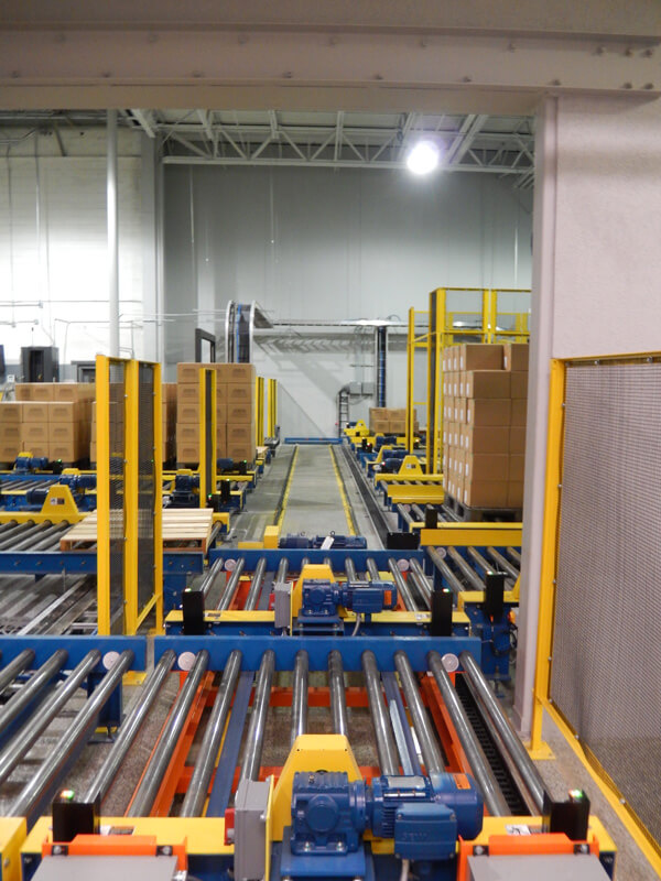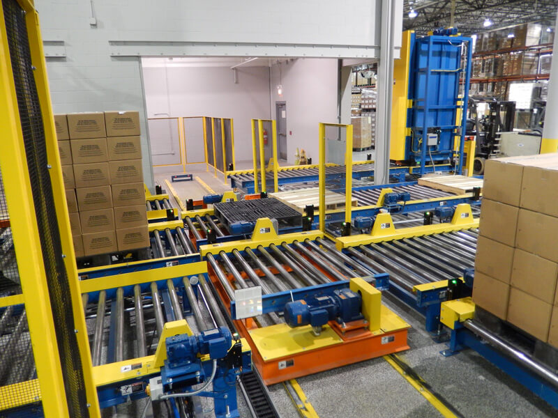The operation transfers packages on pallets from the production floor to robotic cells, which pick and place, repalletizing cartons to shipping pallets.