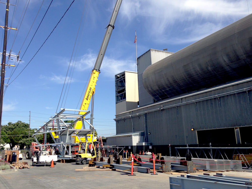 For structural work deep inside an active plant, heavy equipment and steel members often must be craned in over adjacent operational units and landed through an opening created by removing a portion of the facility's roof. This requires meticulous rigging, overhead hazard management, intense safety protocols, and precise traffic control. Raw materials as well as pre-fabricated frames, stairwells, and more can be craned in.
