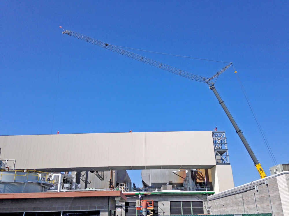 The location of Furnace 2 necessitated that all equipment and material be craned into the work area over Furnace 1. A portion of the Furnace 2 roof was removed to fly and land items into the work area.
