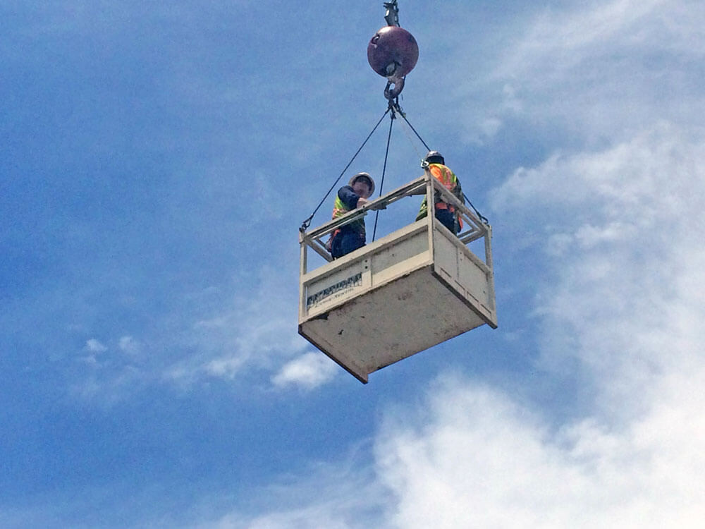 - Crane lands equipment and materials through an opening of the worksite roof