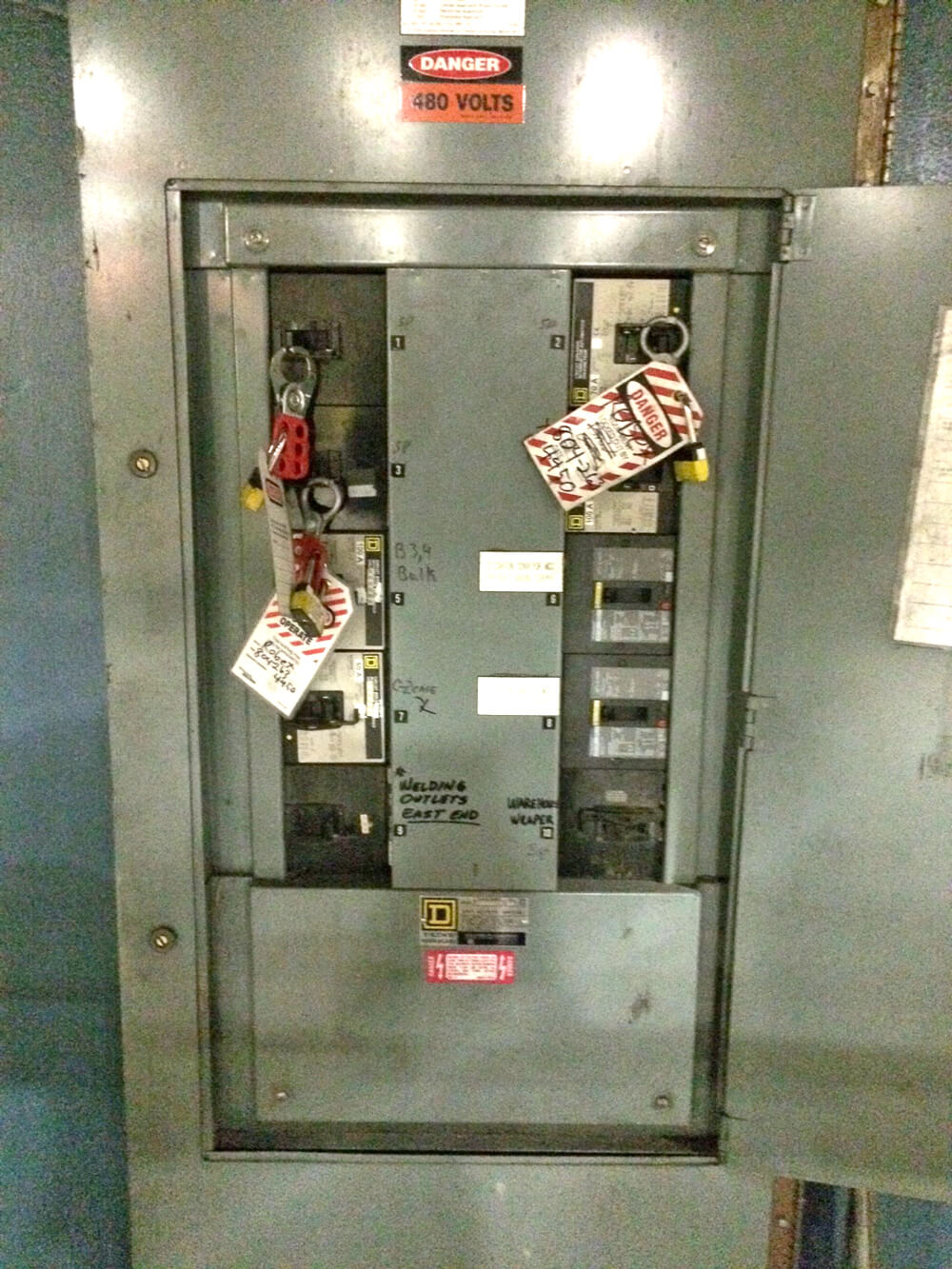 - Electrical control – Shut off & lockout 480v circuit feeding robot, welder, conveyor drives & control power panel (LV data controls, PLCs, light sensor bars and gate entry sensors).