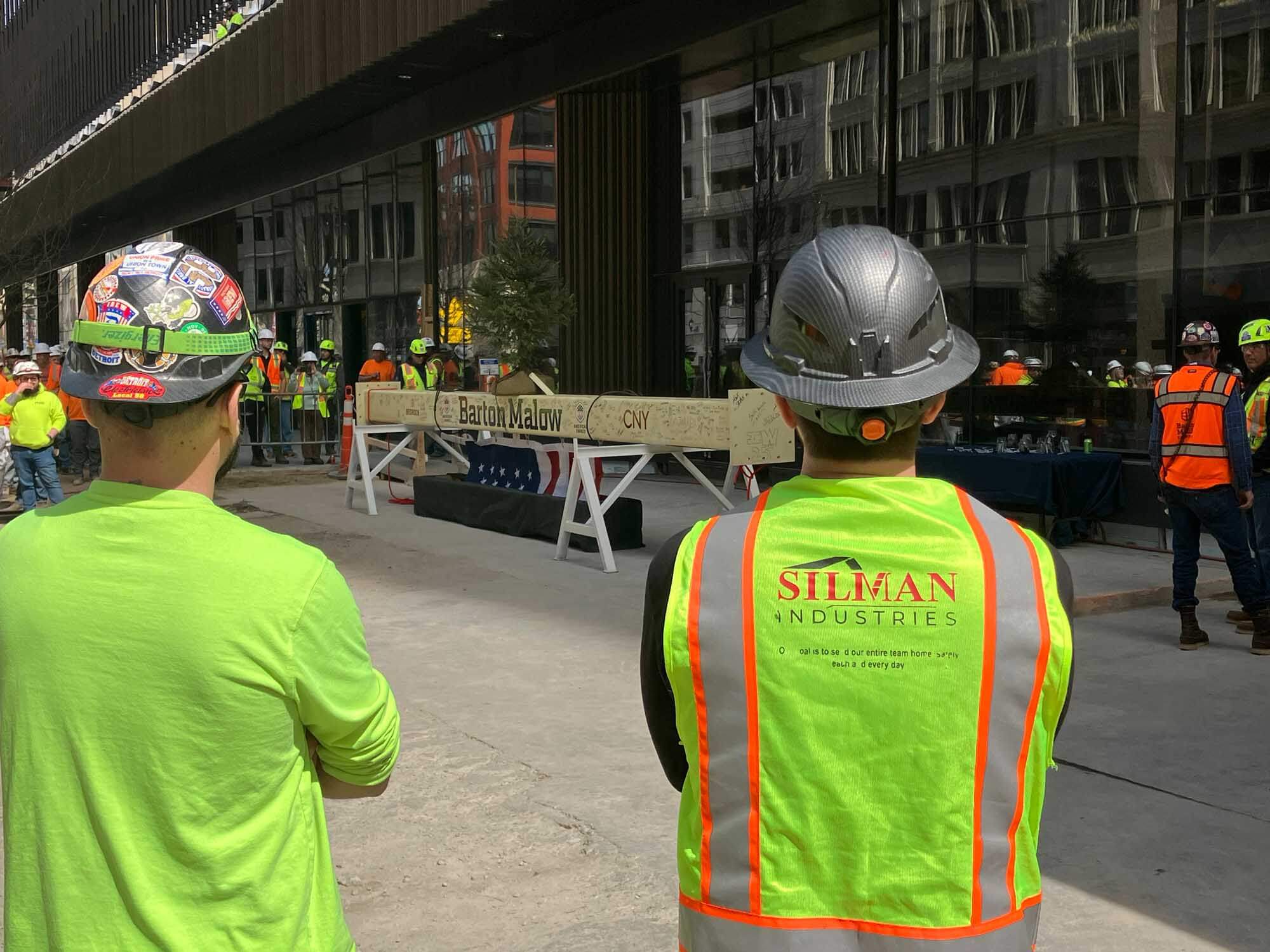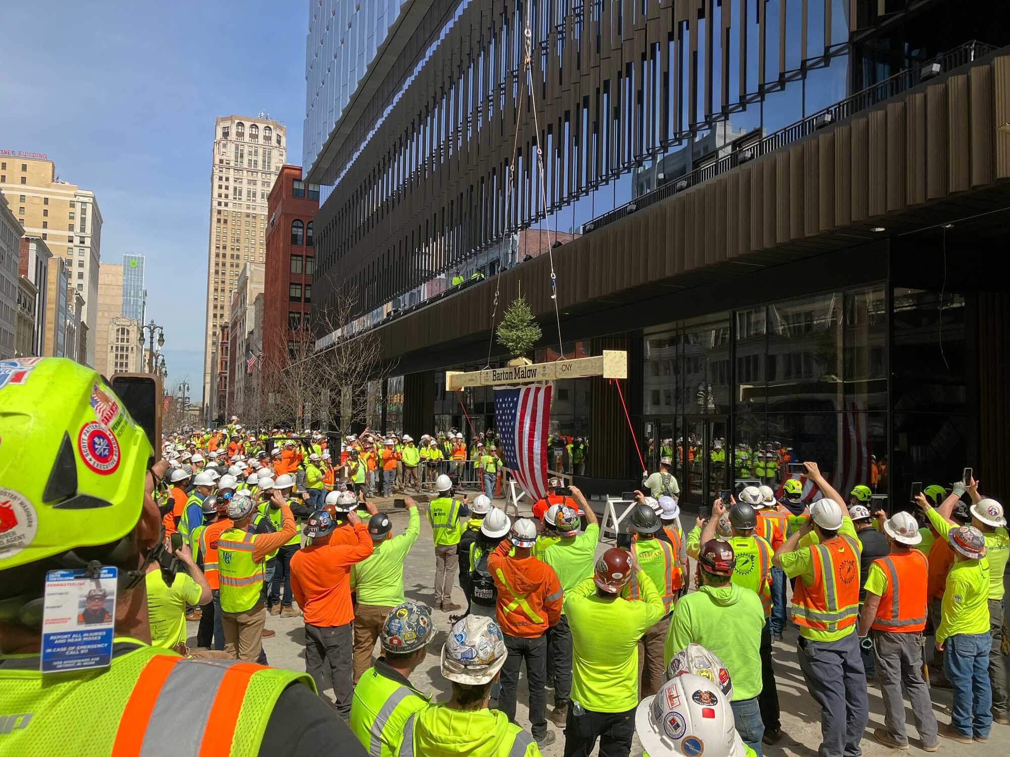 It was a big day at Hudson’s in Detroit, Michigan as the final beam was placed at the top of the structure in a ceremony known in the construction industry as “topping out.” Hundreds of people attended the milestone event, and the local NBC affiliate captured some aerial footage of the steel member being lifted to the structure’s apex. The festive event also included a lunch for the entire crew.